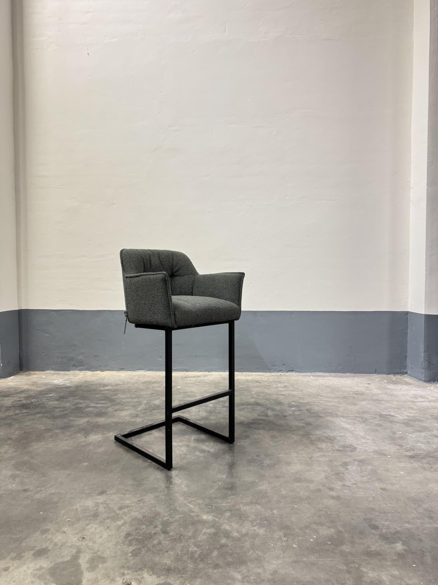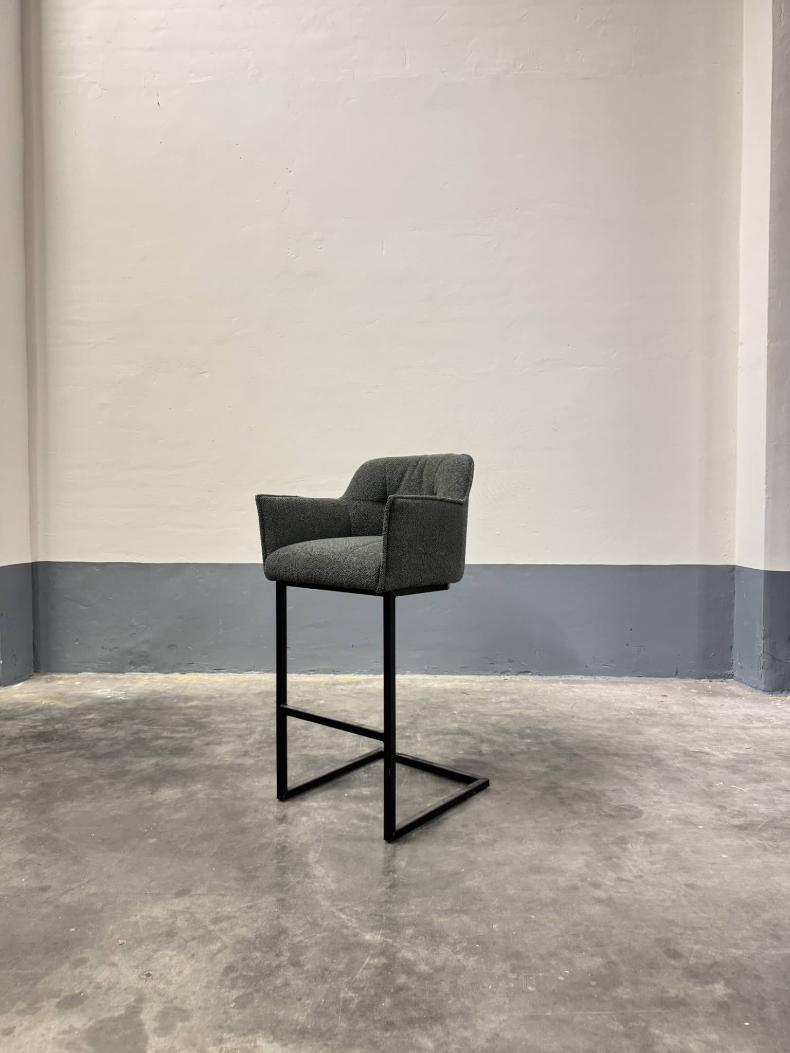 Tweedehands barkruk van PMP, uitgevoerd in blauwe suède stoffering. Comfortabele barkruk voor bar-, pantry- en projectomgevingen.
