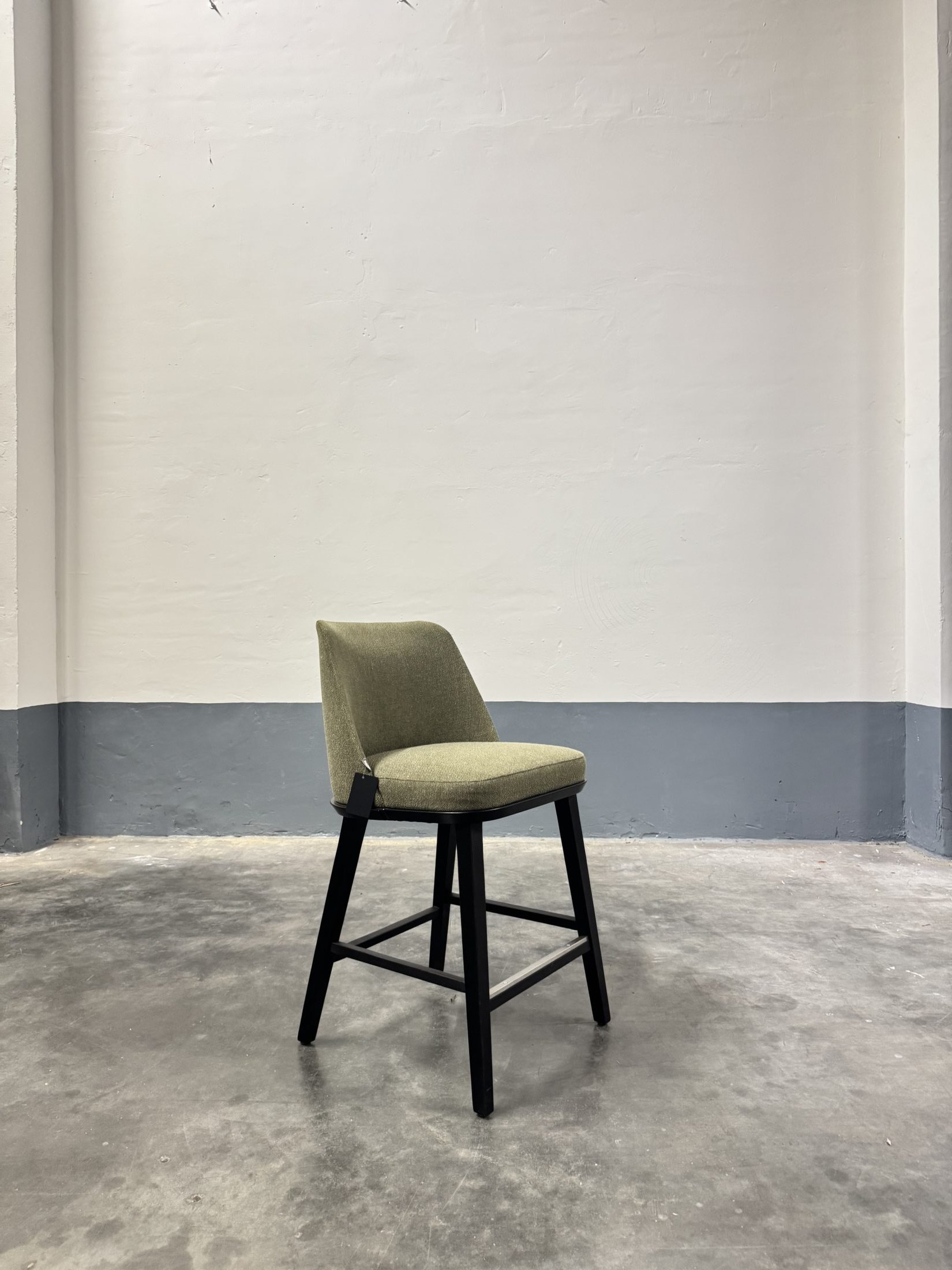 Tweedehands PMP Oslo barkruk met een zithoogte van 65 cm, uitgevoerd in groene teddy stoffering. Geschikt voor gebruik aan keukeneilanden en lage bartafels.