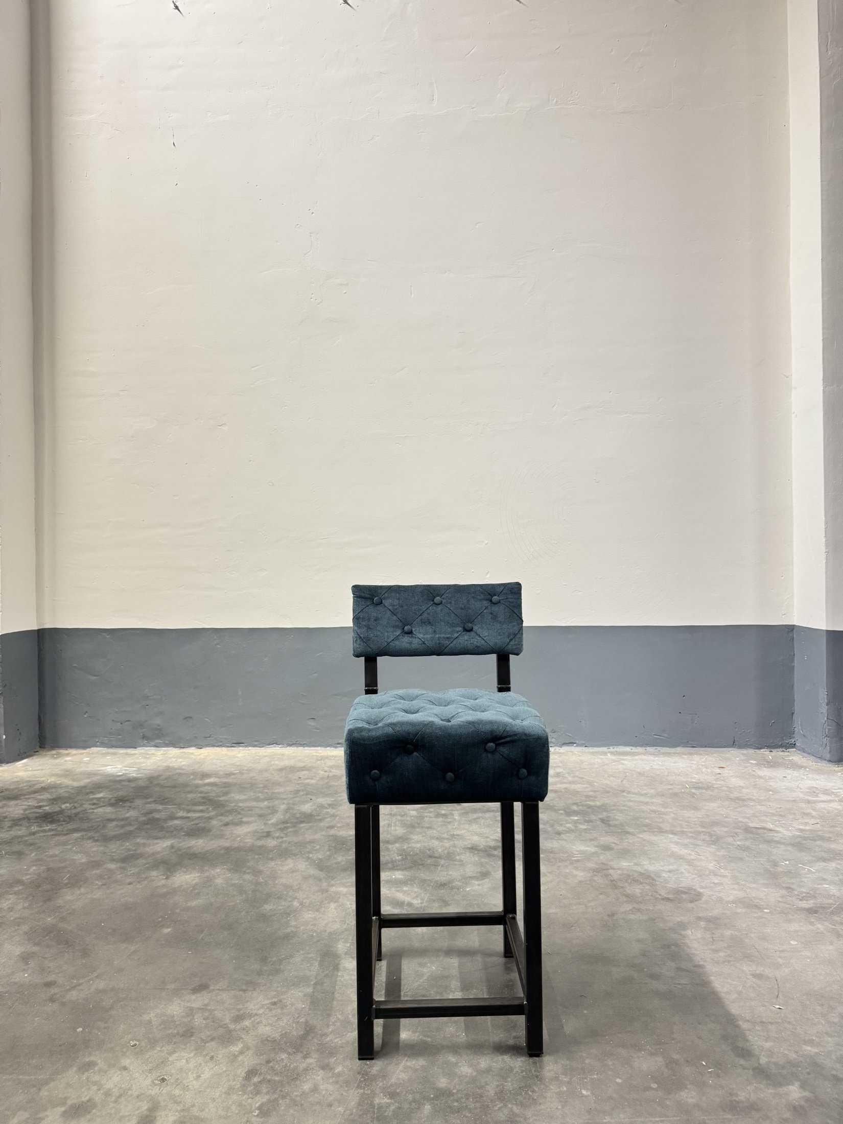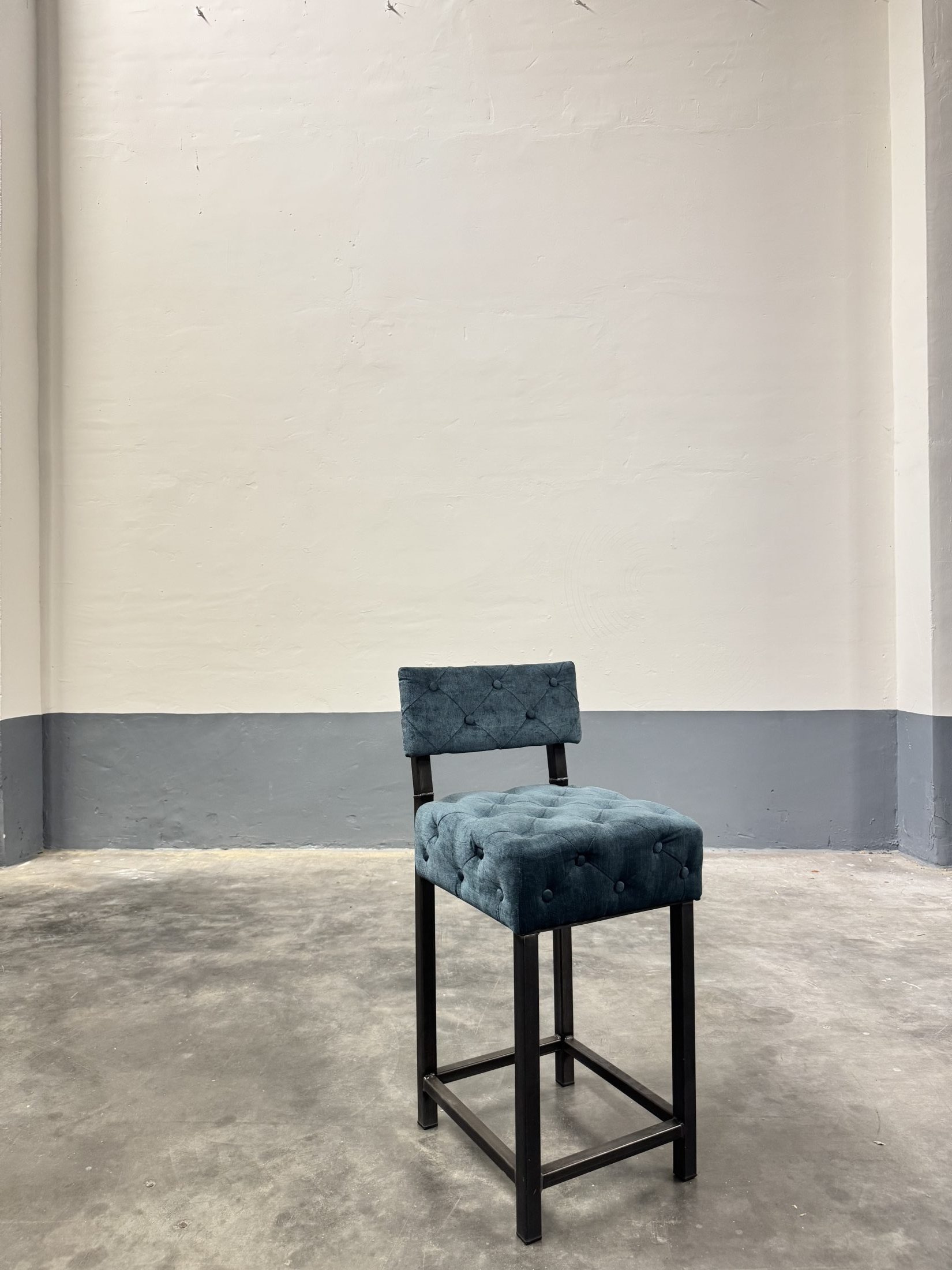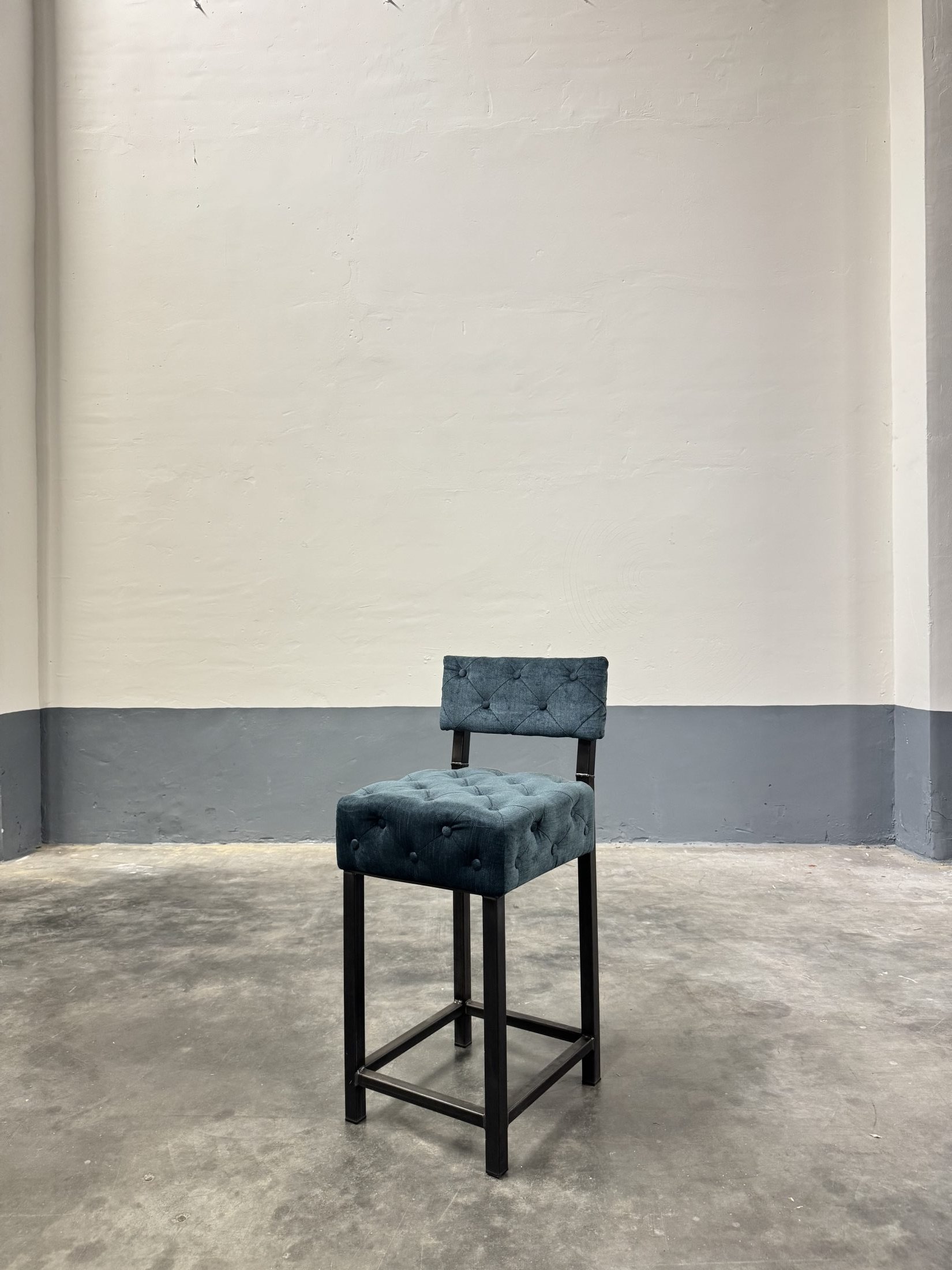Tweedehands barkruk van Schatkamer met een zithoogte van 65 cm, uitgevoerd in blauwe stoffering met knopenpatroon. Geschikt voor gebruik aan keukeneilanden en lage bartafels.