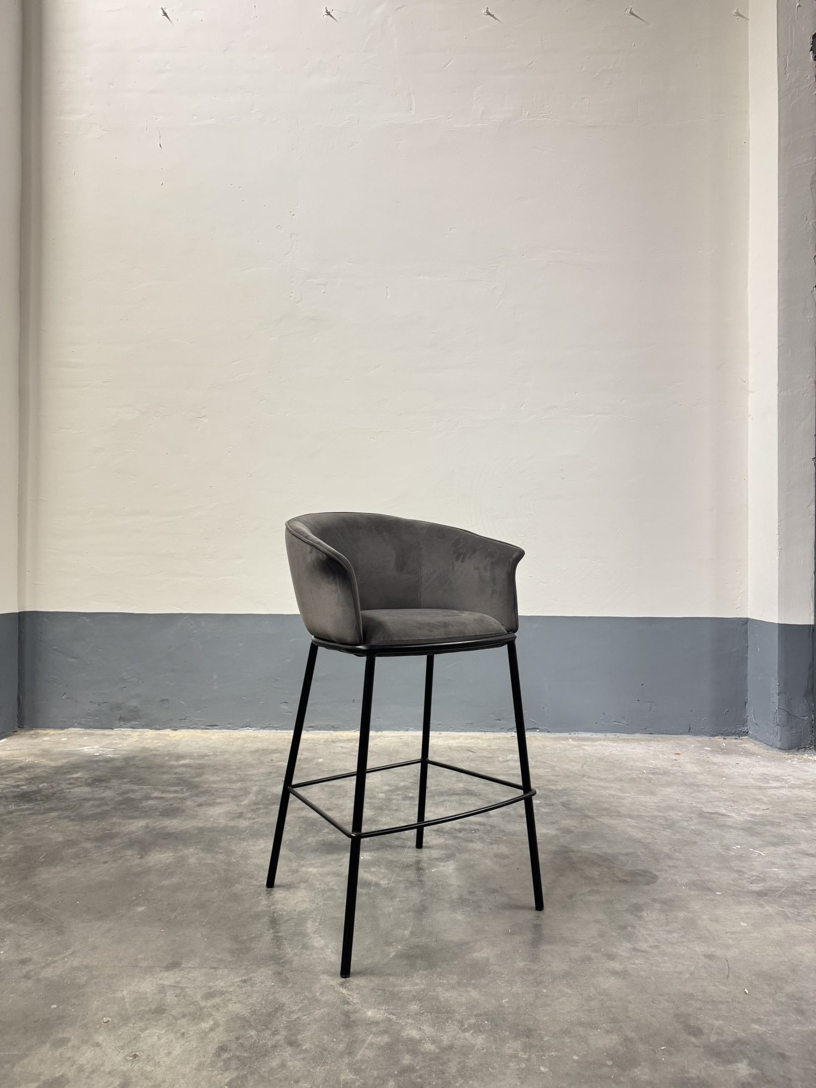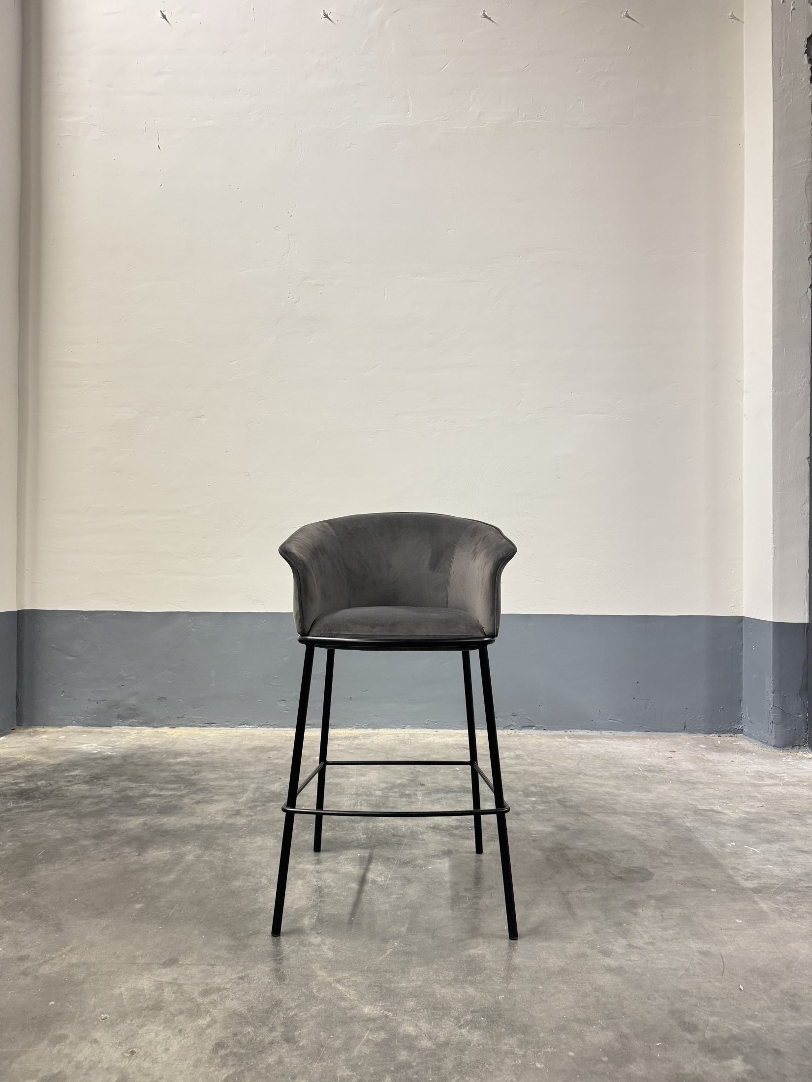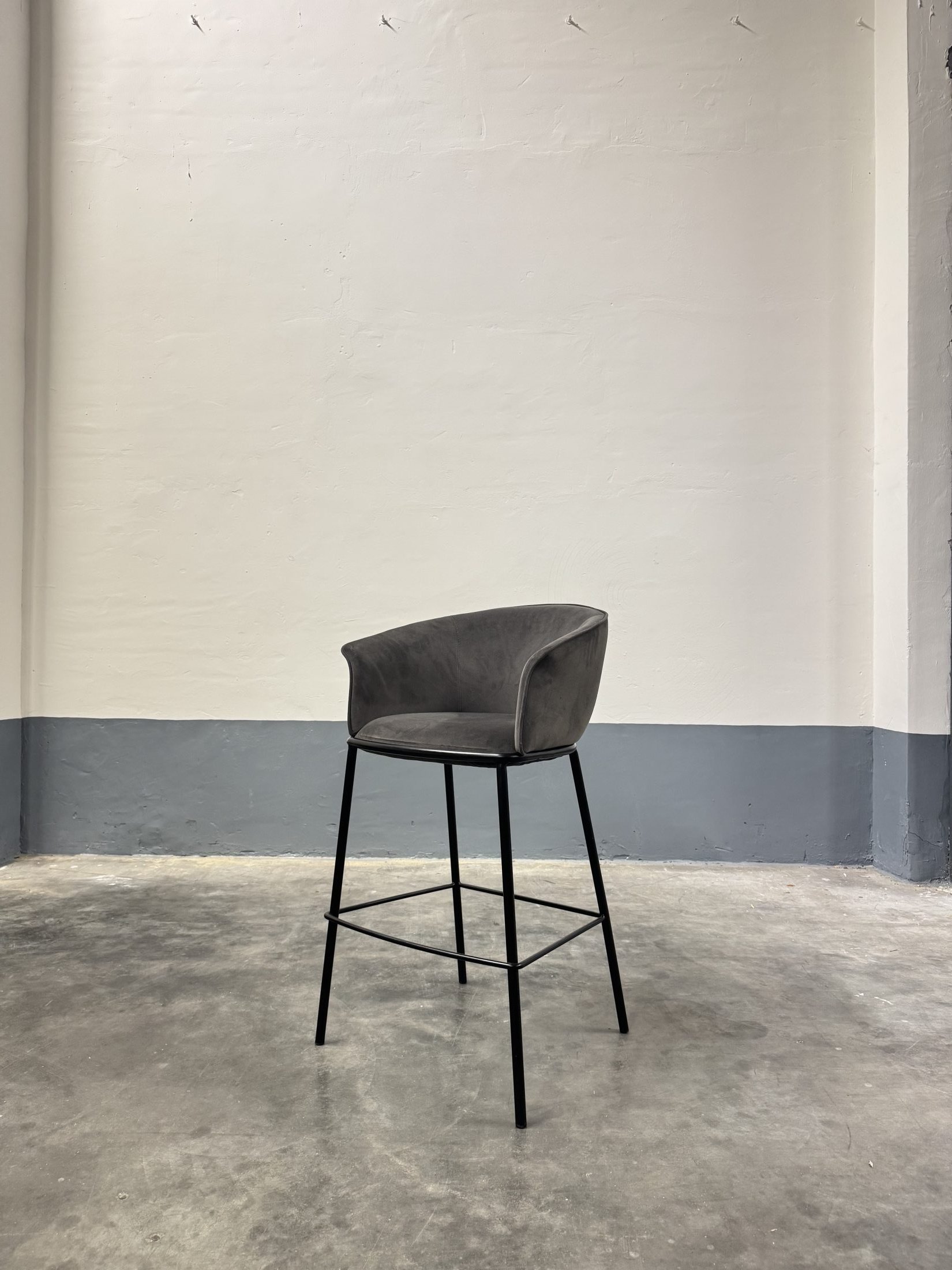 Tweedehands Basco barkruk met een zithoogte van 75 cm, uitgevoerd in grijze suède stoffering. Geschikt voor gebruik aan bartafels en hoge werkbladen.
