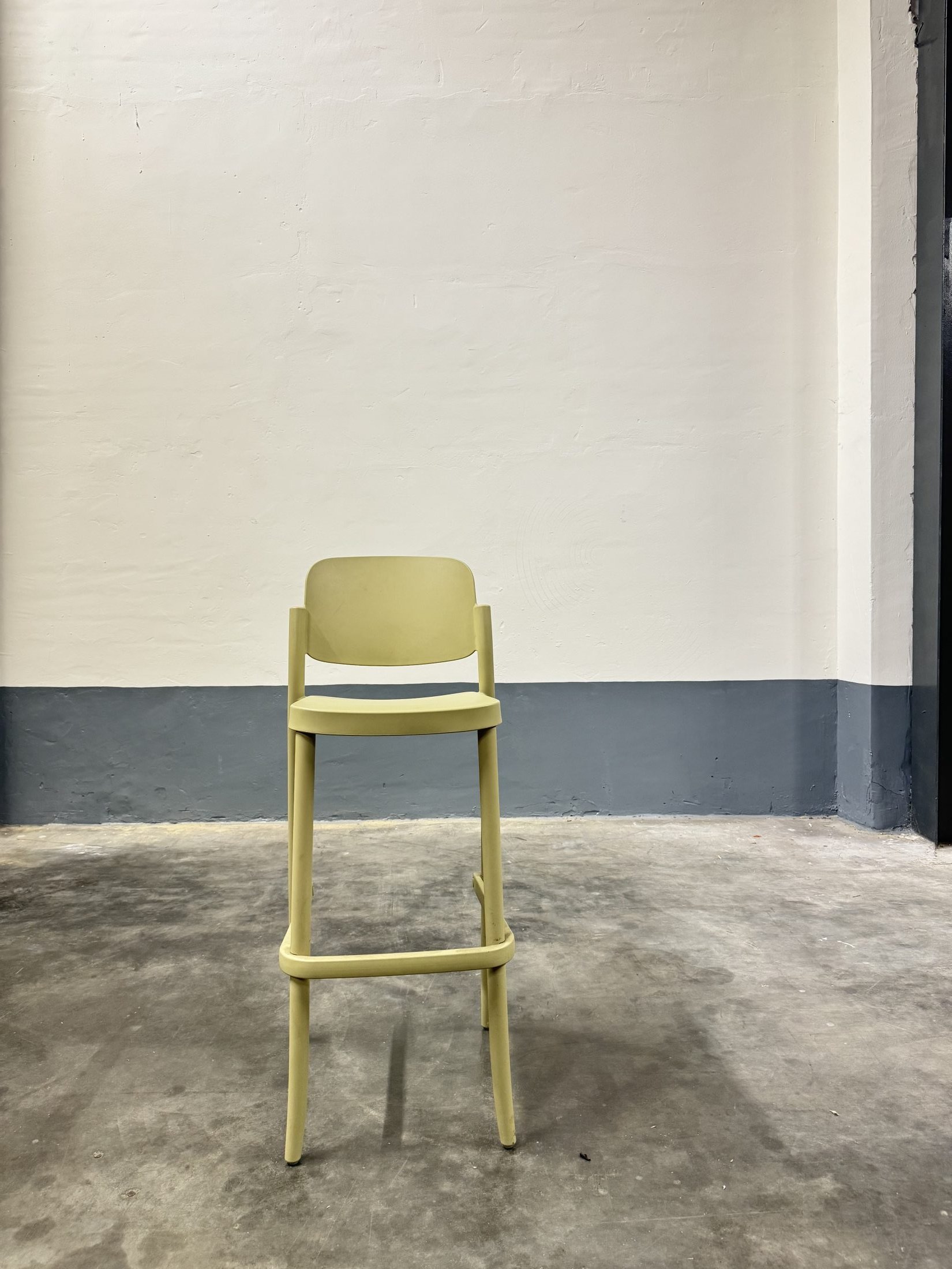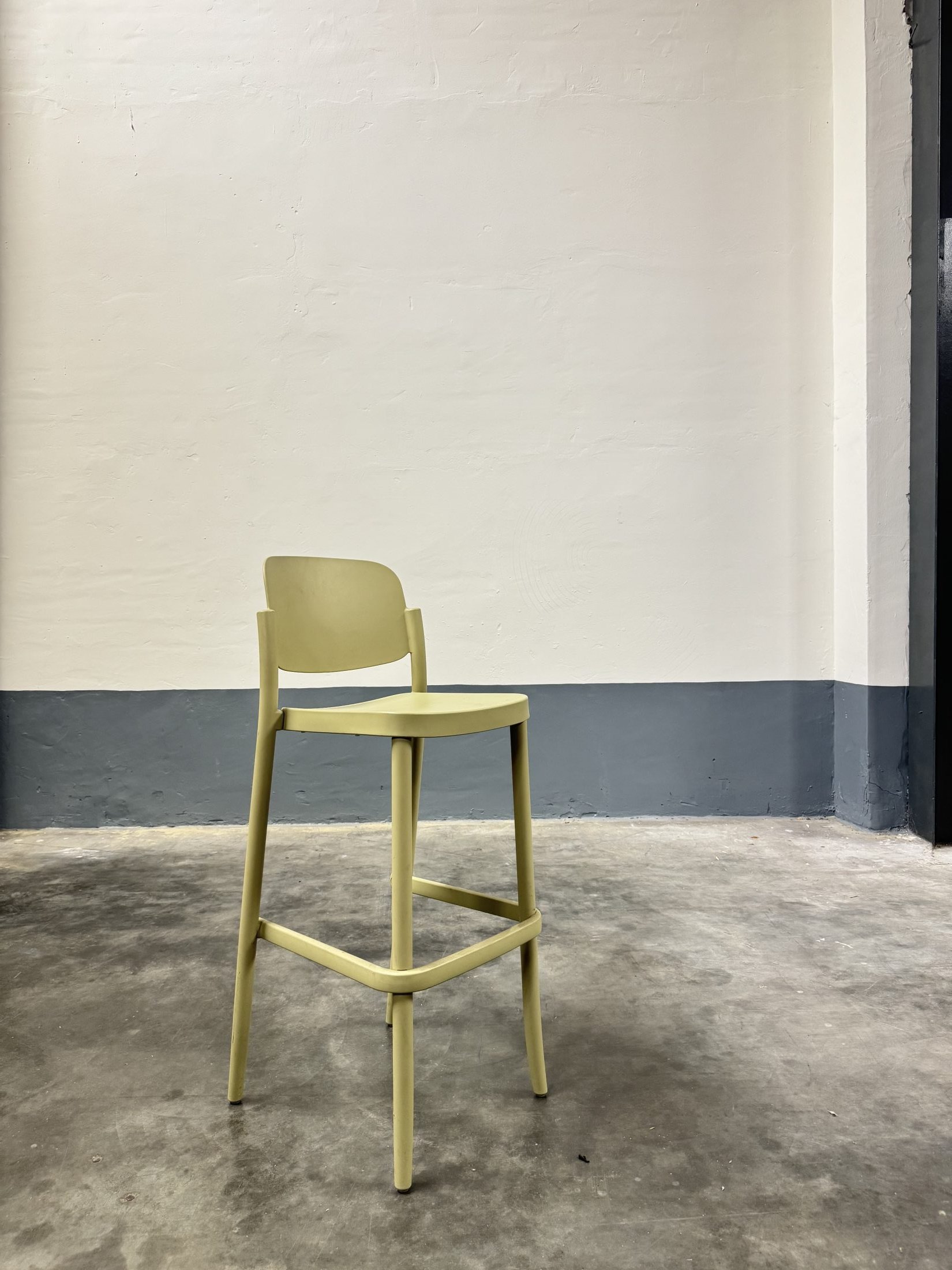 Tweedehands barkruk met een zithoogte van 80 cm, uitgevoerd in groen kunststof. Geschikt voor gebruik aan hoge bartafels en baropstellingen.