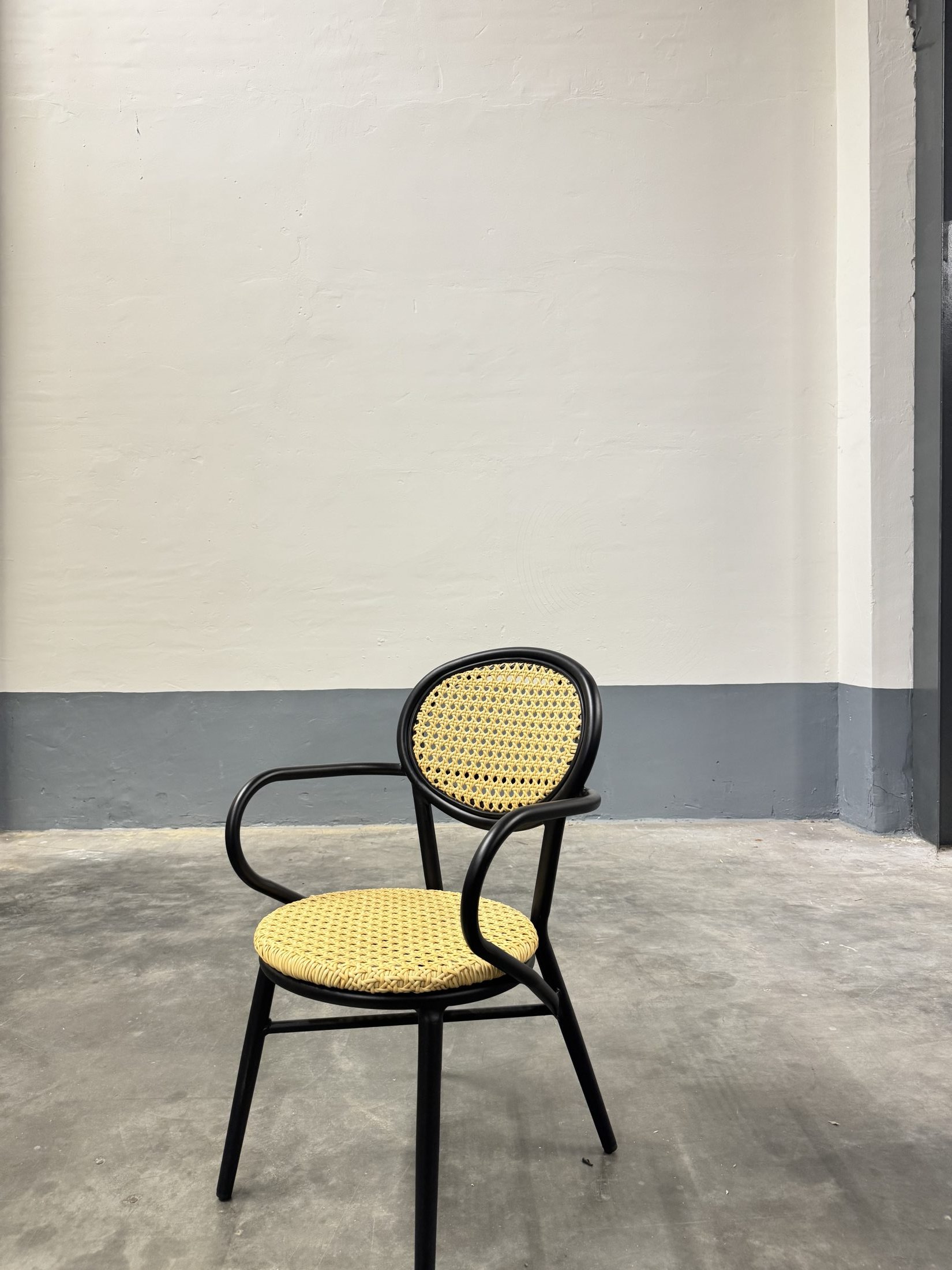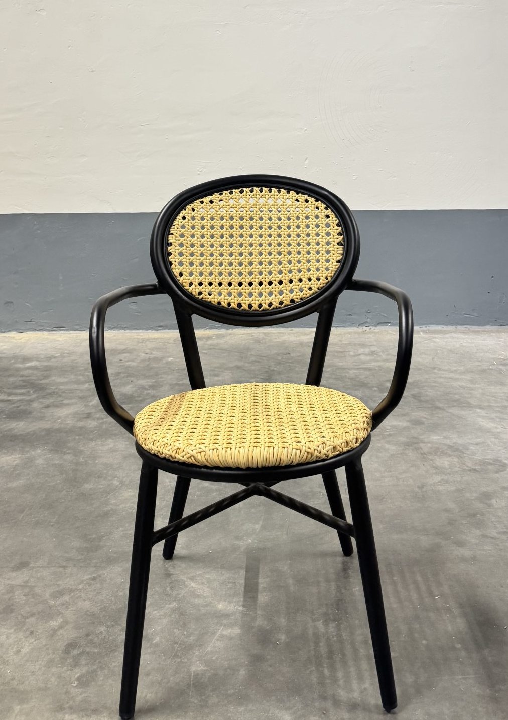 Tweedehands terrasstoel van PMP uitgevoerd in zwarte kleur met rieten afwerking. Geschikt voor gebruik op terras, patio en buitenruimtes.