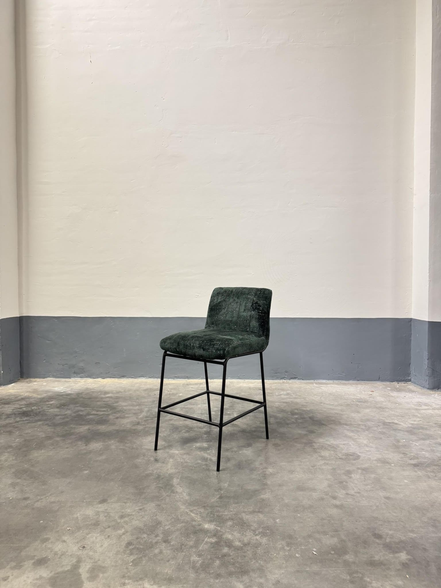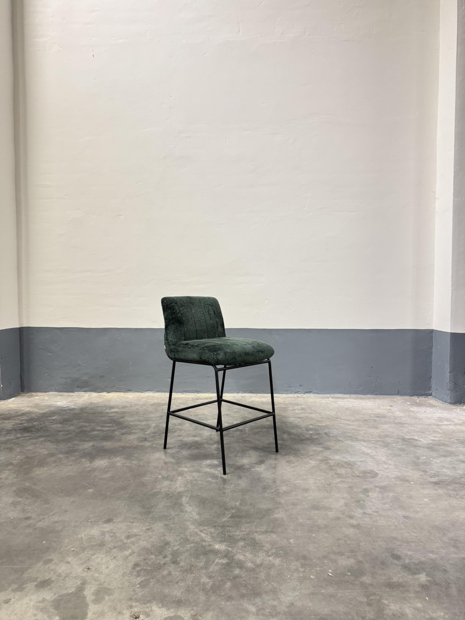 Tweedehands barkruk van Elio met een zithoogte van 65 cm, uitgevoerd in groene stoffering. Geschikt voor gebruik aan lage bartafels en keukeneilanden.