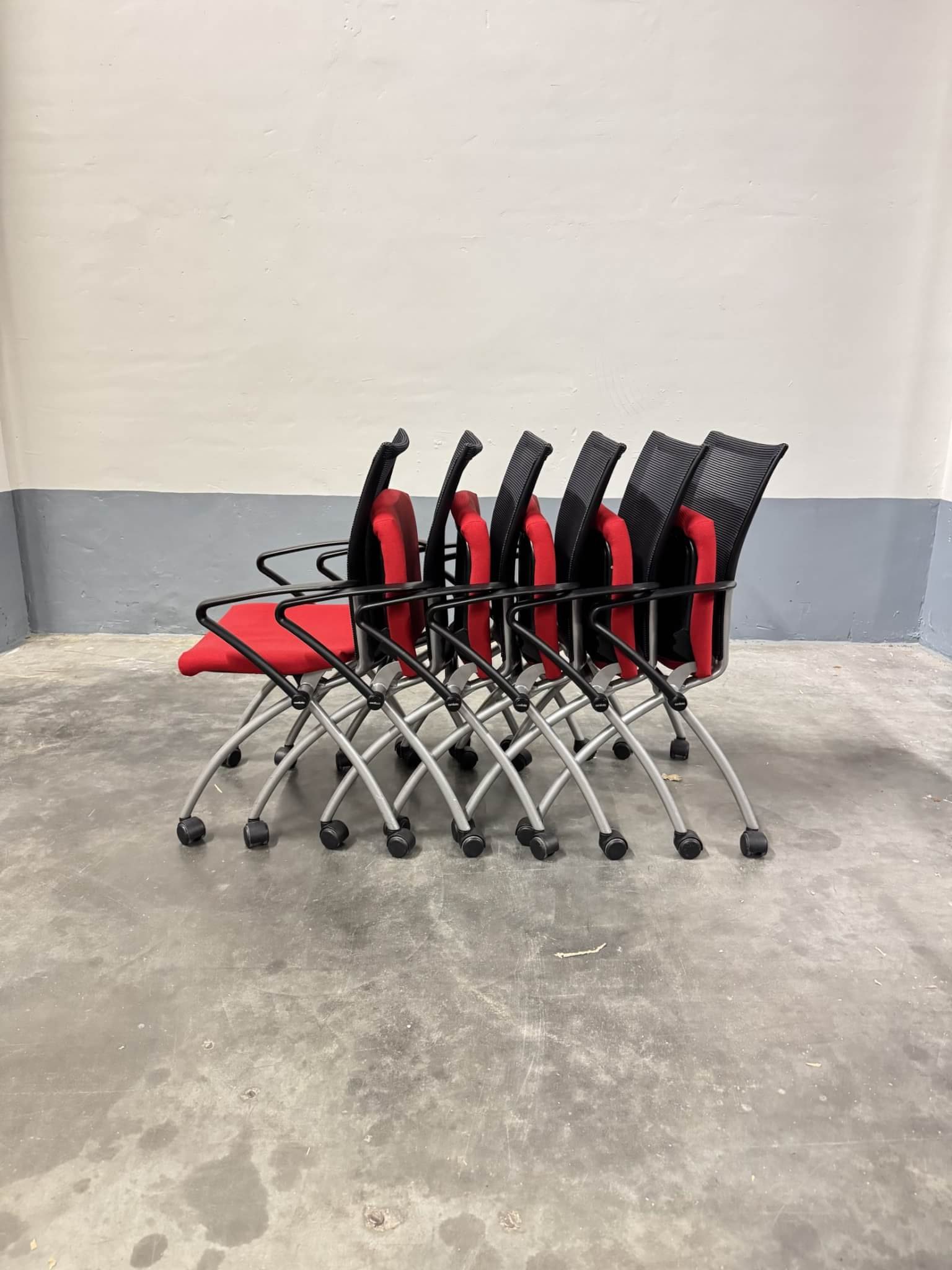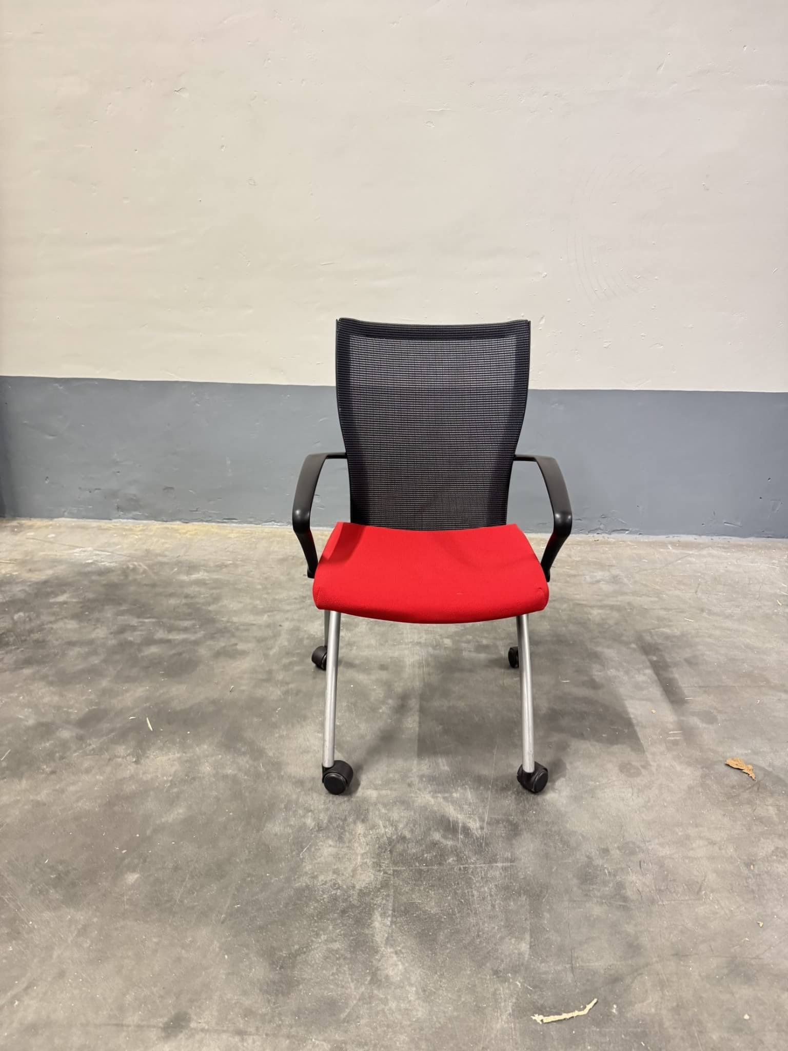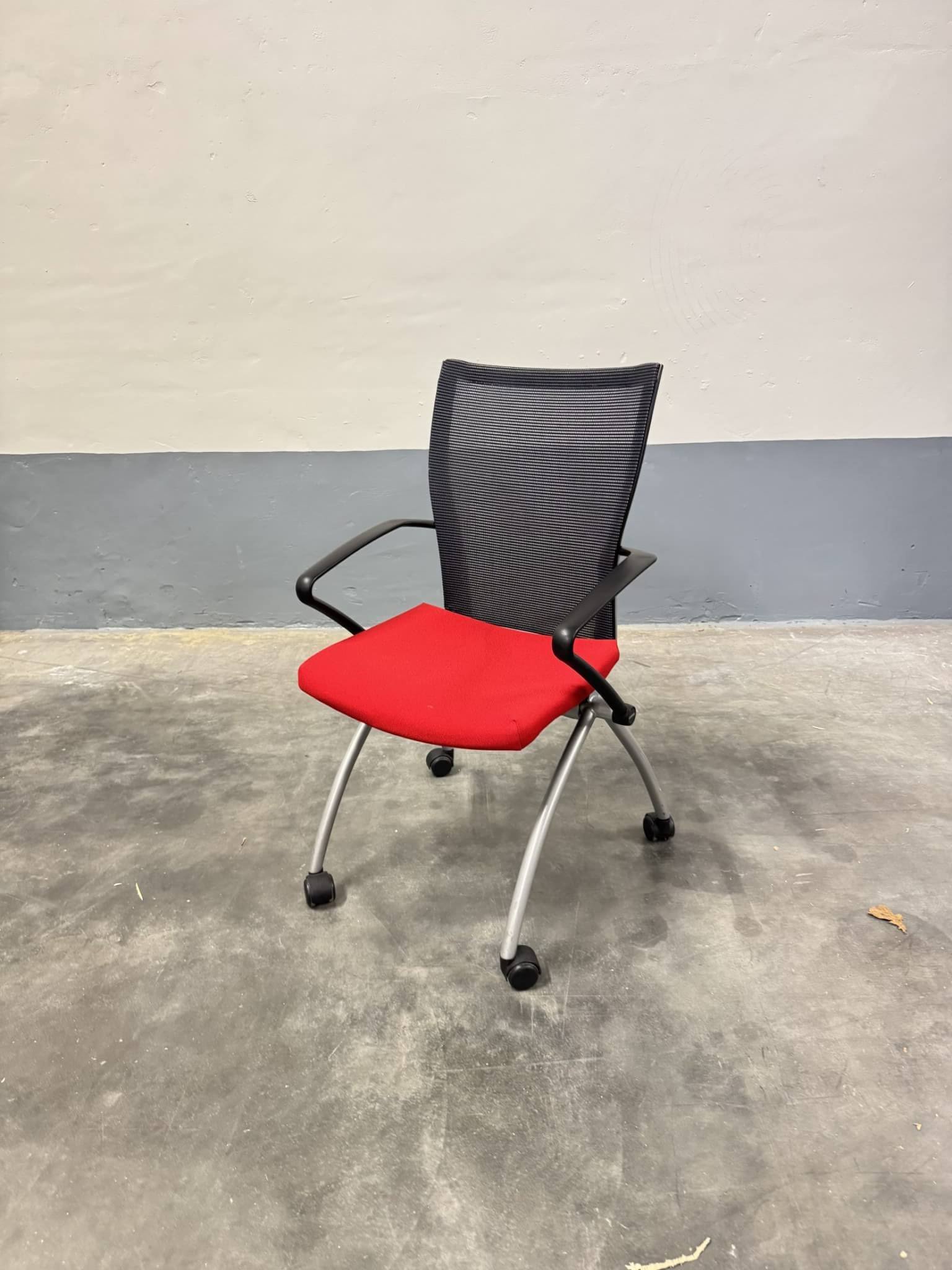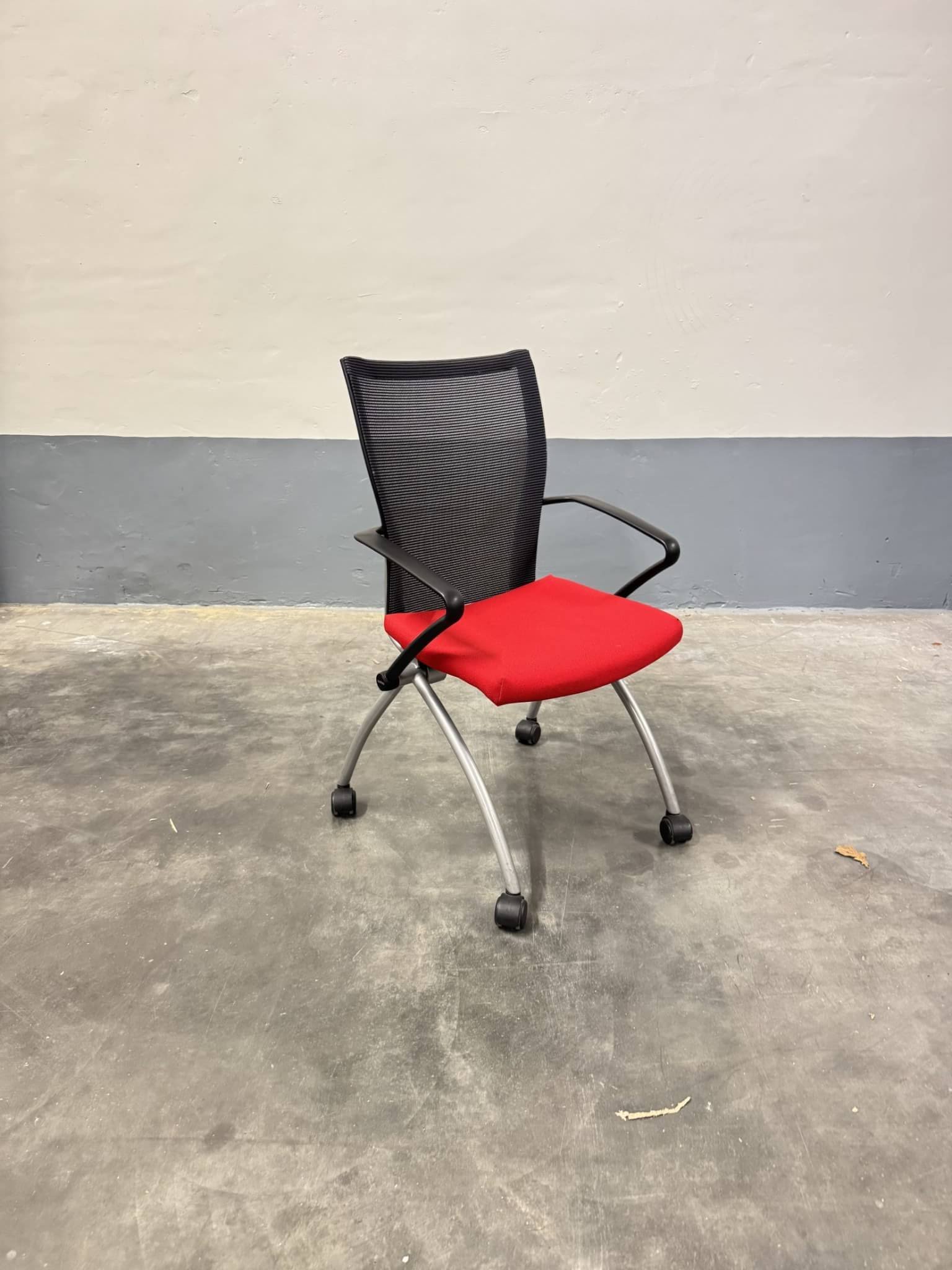 De Comforto bezoekersstoel is een praktische, stapelbare stoel met wielen en een inklapbaar frame. Dankzij het lichte ontwerp, het ademende netrug en de opvallend rode zitting biedt deze tweedehands stoel zowel comfort als flexibiliteit voor vergaderruimtes, opleidingen of kantoren.