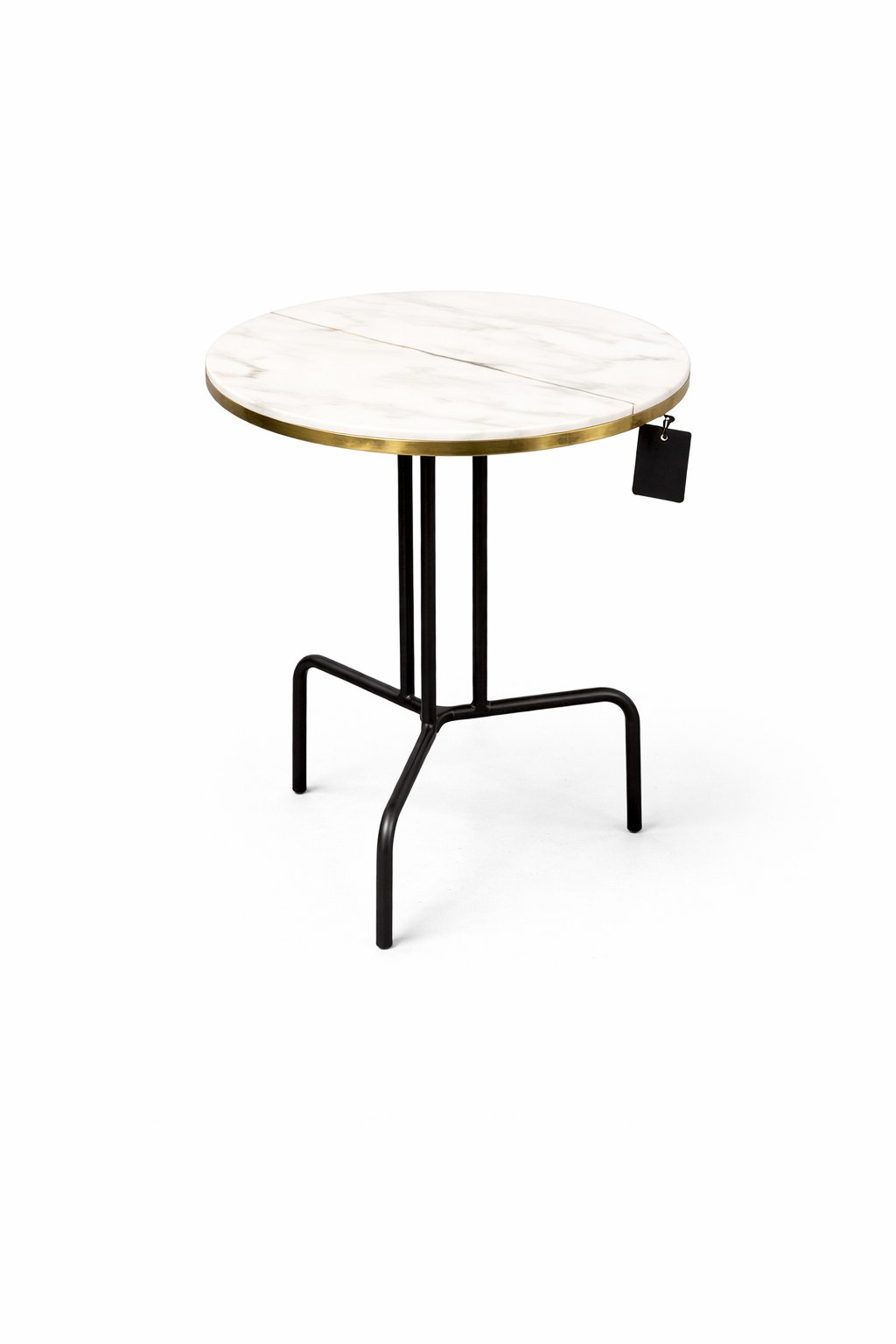 Het witte marmerlook tafelblad wordt subtiel omlijst door een goudkleurige rand, wat de tafel een luxe uitstraling geeft. Het zwarte metalen onderstel met speelse poten zorgt voor stabiliteit en een modern contrast.
