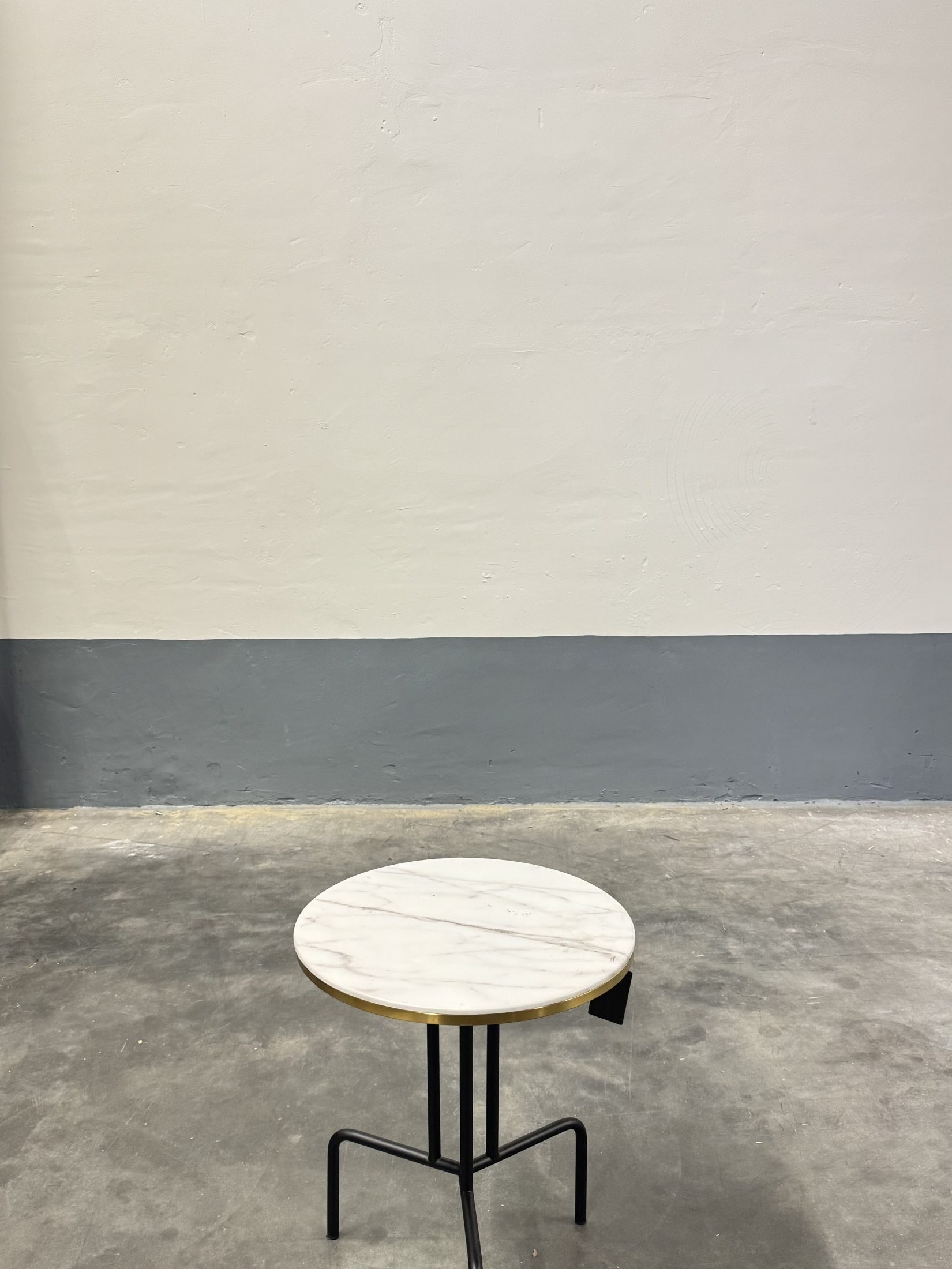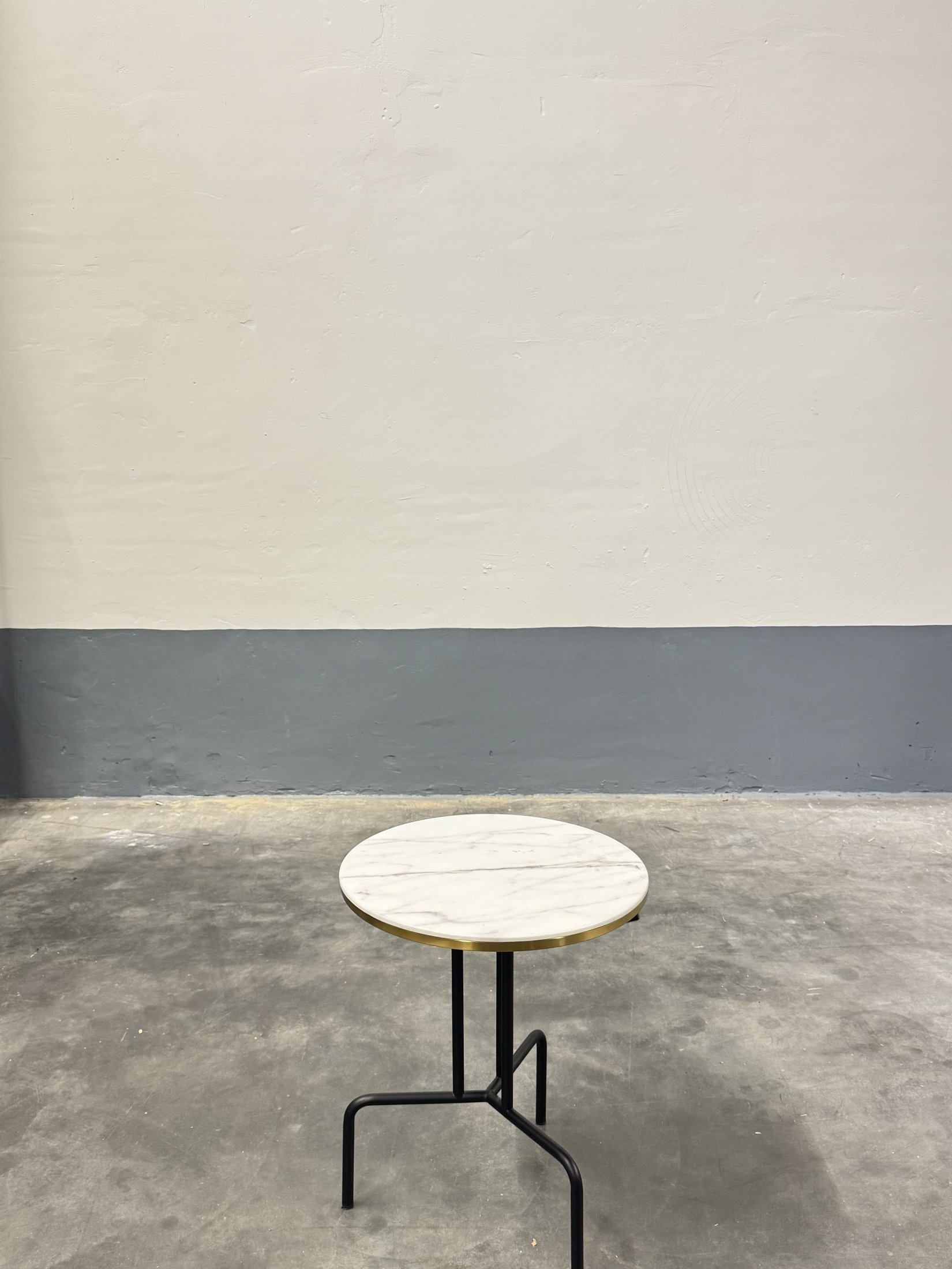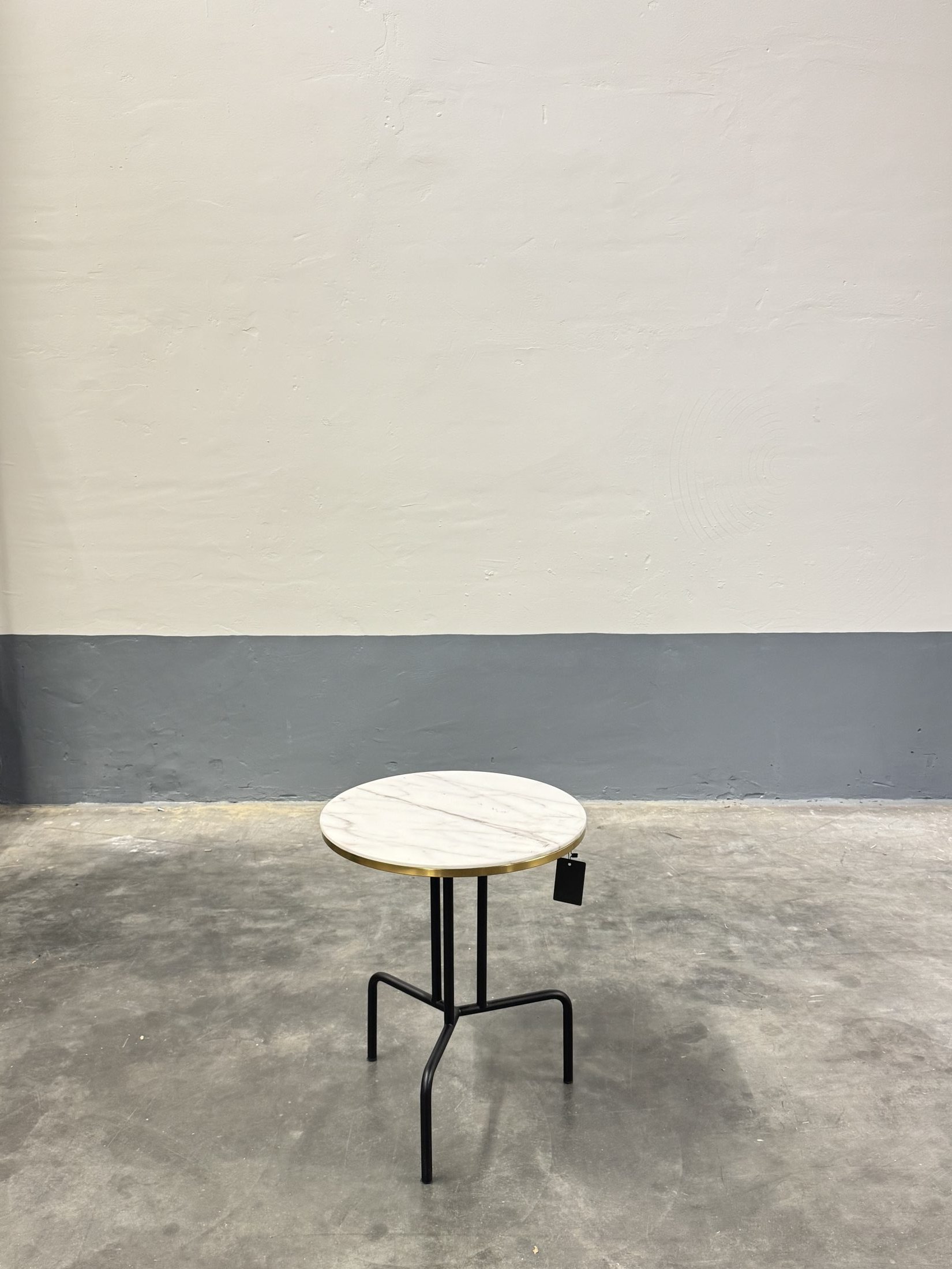 Deze tweedehands ronde salontafel van PMP met een diameter van 50 cm en een hoogte van 60 cm is uitgevoerd met een wit marmerlook blad en een zwart metalen onderstel met goudkleurig detail. Een stijlvolle en compacte tafel, perfect als bijzet- of salontafel.