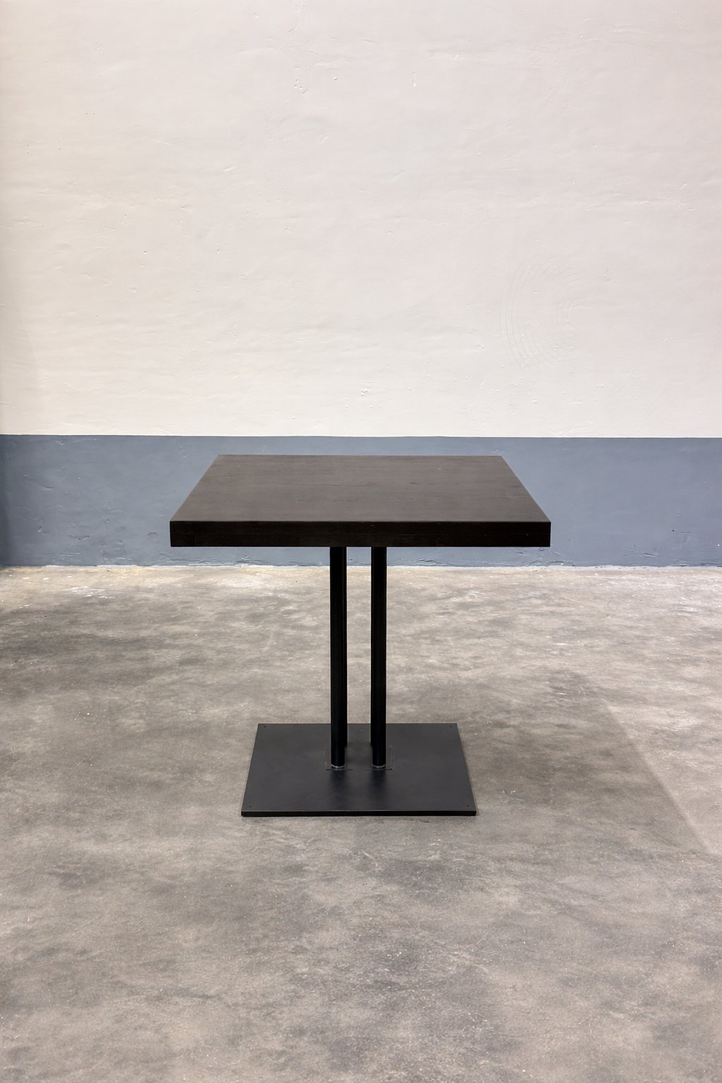 Het donkere tafelblad geeft de tafel een rustige en professionele uitstraling. Het zwarte metalen onderstel met dubbele kolom zorgt voor stabiliteit en een solide constructie.