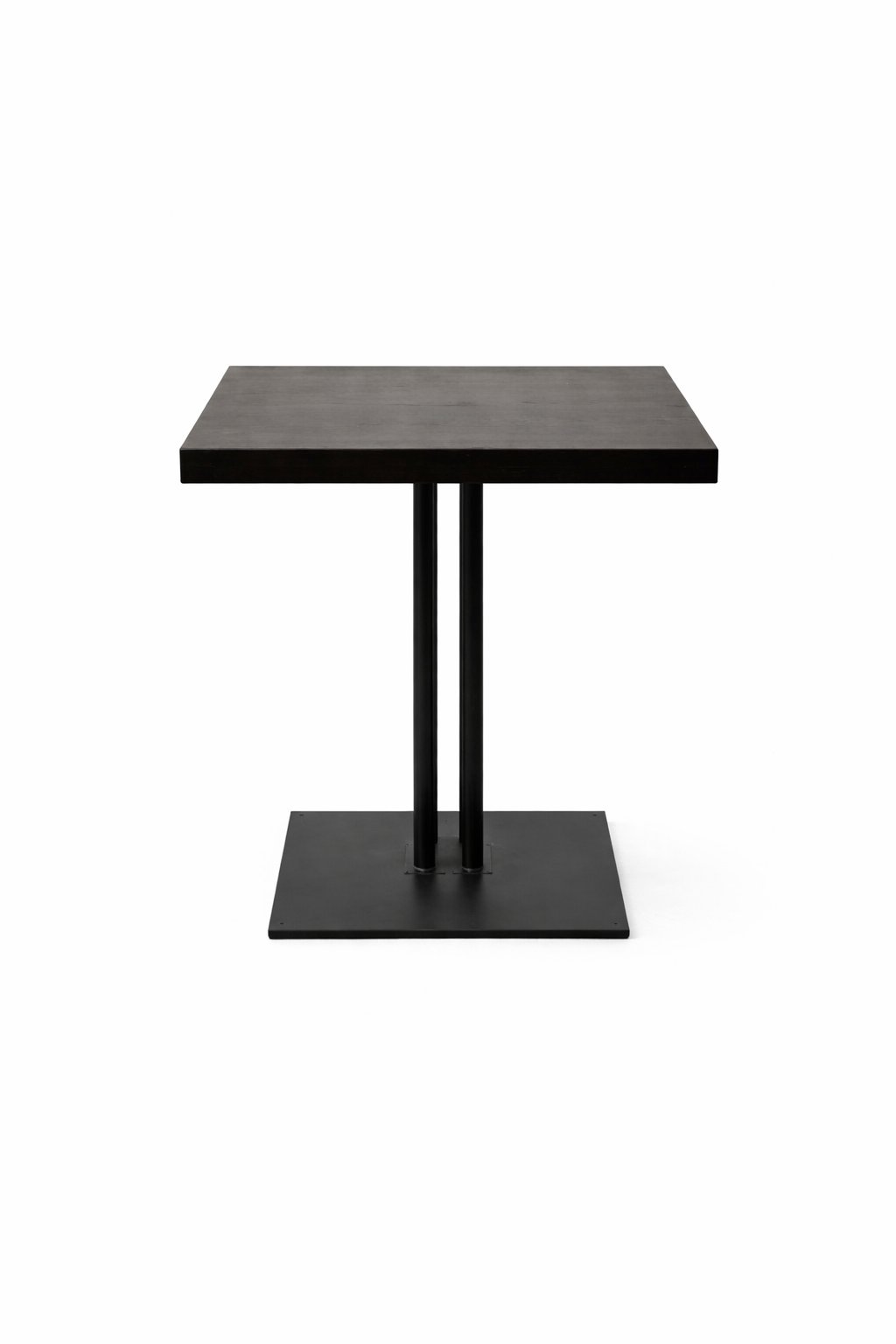 Deze tweedehands vierkante tafel van PMP met een afmeting van 70 x 70 cm is uitgevoerd met een donker tafelblad en een zwart metalen onderstel. Een compacte en stevige tafel, ideaal voor horeca, kantines, wachtruimtes of kantooromgevingen.